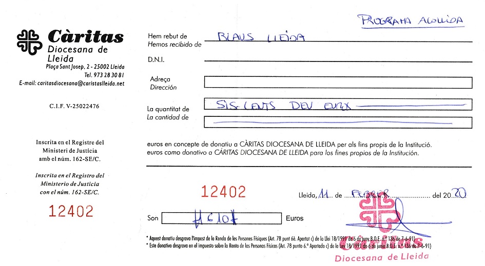 Gràcies, un any més la festa de les Blaus acaba amb concert solidari. S’han recaptat 610 euros que aniran destinats integrament al programa Acollida de Càritas Lleida.