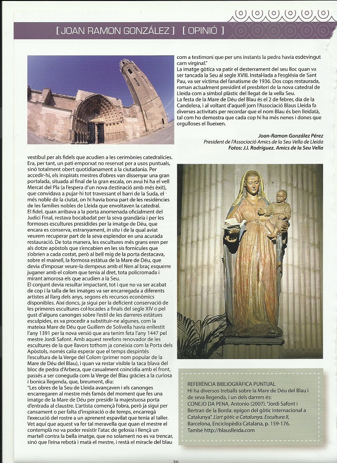Jordi Safont, amb la col·laboració de Bertran de la Borda, realitzà l’encàrrec i esculpí la meravellosa imatge de la Mare de Déu del Blau i substituí l’escultura d’en Solivella, i l’any 1448 fou col·locada al mainell o trencallums del Portal dels Apòstols.